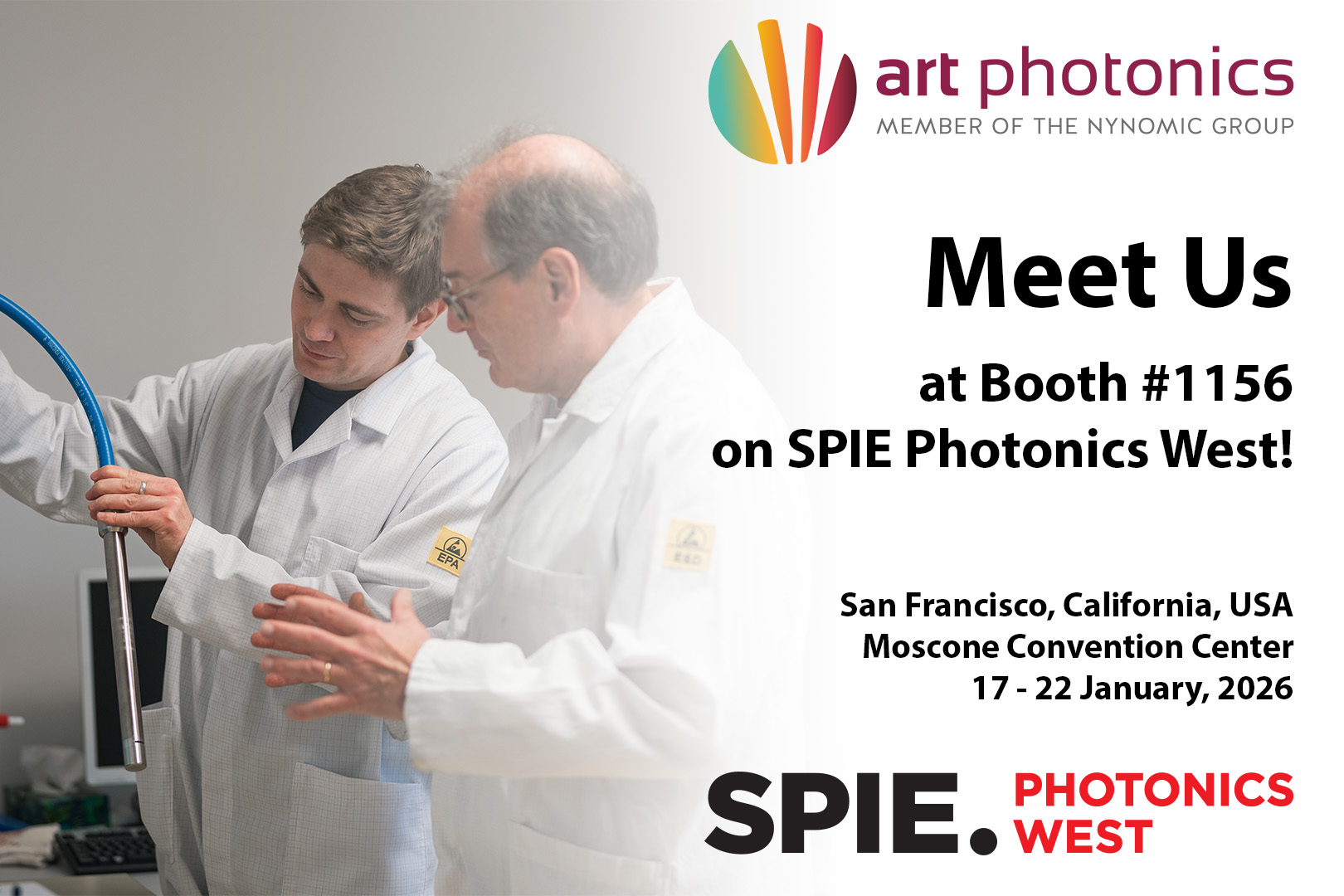 Die art photonics GmbH freut sich, ihre Teilnahme an der SPIE Photonics West 2026 bekannt zu geben, der weltweit führenden Veranstaltung für Laser, Photonik und biomedizinische Optik. Wir laden Sie herzlich ein, uns an Stand #1156 zu besuchen und zu entdecken, warum art photonics der bevorzugte Partner für faseroptische Sonden und Fernerkundungslösungen („Remote Sensing“) im gesamten Spektralbereich von UV bis MIR ist.